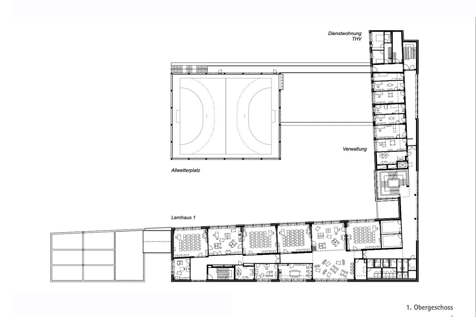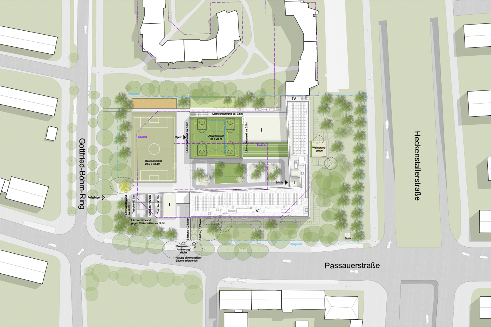 Der auf den Turnhallen befindliche Allwetterplatz verfügt sowohl über die notwendigen Fangzäune, (Abstandsflächen zum Nachbarn sind berücksichtigt) als auch über zusätzliche Schallschutzwände nach Norden, Süden und Westen. Der Gebäude-Schenkel an der Passauerstraße wird entlang der Straße in Richtung Süden durch einen eingeschossigen Appendix verlängert. Hier befinden sich die Anlieferung, Feuerwehrzufahrt, Außenlager, Müll und Fahrradstellplätze. Im Eingangsbereich in Richtung Gottfried-Böhm-Weg gelegen befindet sich zudem das Rasenspielfeld.