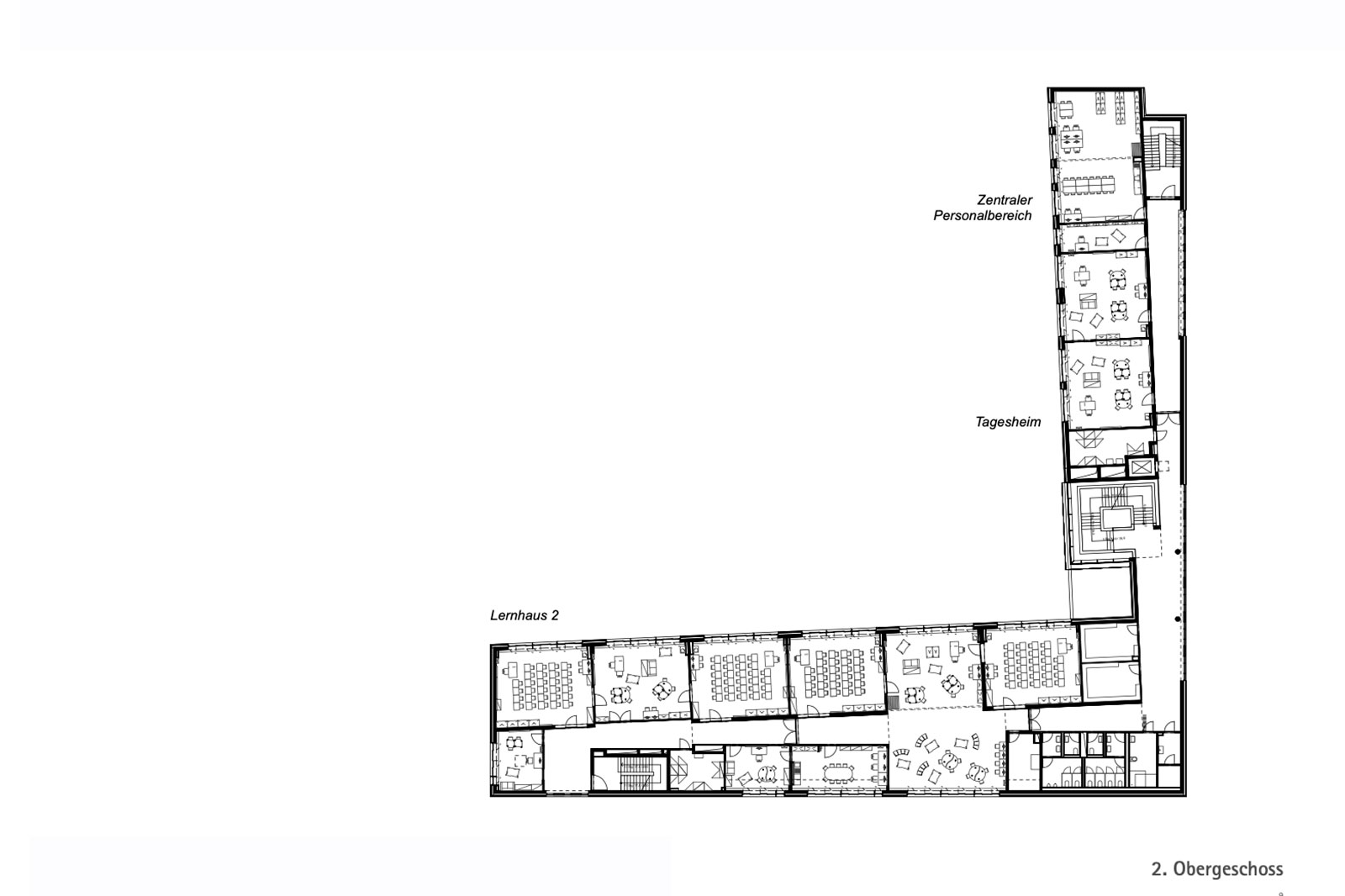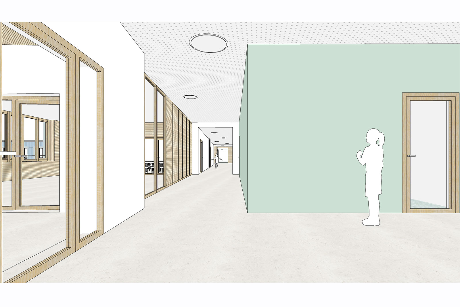Um diesen vorrangigen Parametern Rechnung zu tragen, weicht der Baukörper in seiner Typologie von den gängigen Münchener Schulneubauten ab.