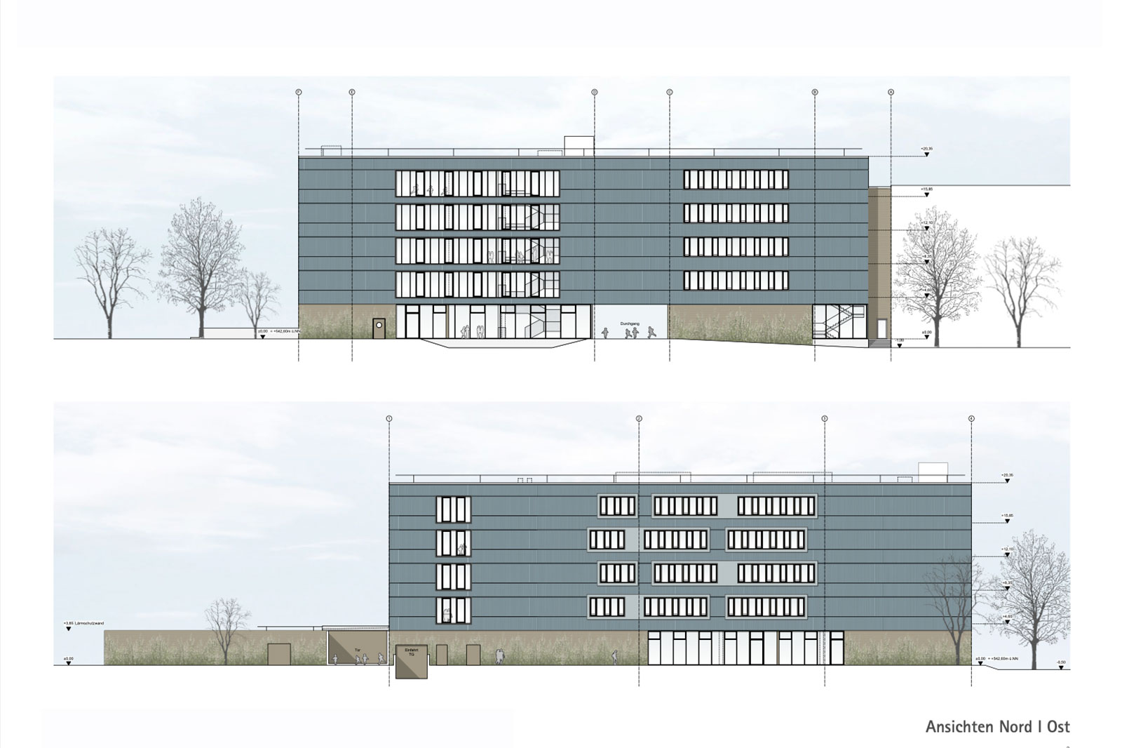 Um wiederum die im Westen angrenzende Wohnbebauung vor den Schallemissionen des Schulhofes zu schützen, sind die Turnhallen unter Berücksichtigung der Abstandsflächen so orientiert, dass sie wie eine Schallschutzwand wirken.