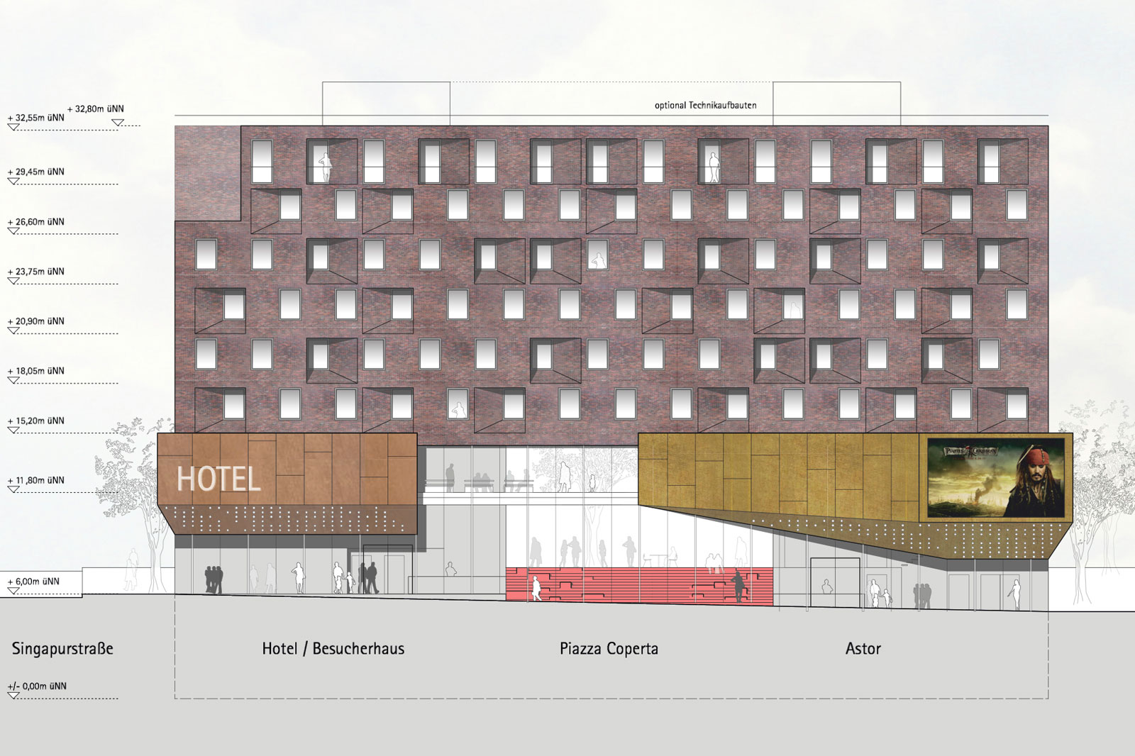 Neben der Akzentuierung des Ortes, ist das Hauptanliegen des Entwurfs einen öffentlichen Ort zu schaffen. An die geplante Piazza im Süden des Grundstücks, die um eine mobile Bühne, Sitzmöglichkeiten im Freien, und einer temporären Überdachung in Form von Faltschirmen ergänzt wird, schließt im Gebäude die Piazza Coperta an. Diese verlängert den Außenraum in das Gebäude hinein und schafft eine fließende stadträumliche Verbindung von Piazza und den einzelnen Foyers am Sandtorkai. Das Erdgeschoss wird durchlässig, hell und großzügig. So schafft es zum Einen eine fließende Verbindung der einzelnen Höhenebenen (Piazza auf +7,50m üNN, Foyers auf +5,00m üNN bis 6,00m üNN), zum Anderen bietet es Raum, der auf unterschiedlichste Weise von den einzelnen Parteien bespielt werden kann - gemeinsam, unabhängig oder in Kooperationen mit Anderen. Die Möglichkeiten sind vielfältig. Die bauliche Trennung der jeweiligen Nutzungen ist in Form eines raumhohen Möbels gegeben. Dieses nimmt Bar und Counter auf der Astorseite, sowie die Showküche und das Buffet auf der Hotelseite auf, und schafft auf beiden Seiten neue Sitzmöglichkeiten in der Foyerlandschaft. Die Grenzen der Nutzungen sind klar definiert und unabhängig voneinander, ohne das die Offenheit und Großzügigkeit der Foyerlandschaft beeinträchtigt wird. Die Foyers, zum Sandtorkai hin orientiert, folgen dem Straßenverlauf. Bieten den Zugang zu Hotel und dem Astor Kino. Fahrstühle gewährleisten, dass jedes Höhenniveau barrierefrei erreicht werden kann. Die Hafenbühne orientiert sich zur Piazza hin und stärkt so den öffentlichen Charakter des neu geschaffenen Ortes. Vorder- und Rückseite des Gebäudes werden gleichwertig. Durch ihre Anordnung innerhalb des Gebäudes und die interne Organisation kann die Hafenbühne sowohl als eigenständiger Ort für Kultur, Konzerte oder Lesungen dienen, sowie als Erweiterungsfläche des Restaurantbereichs herangezogen werden.