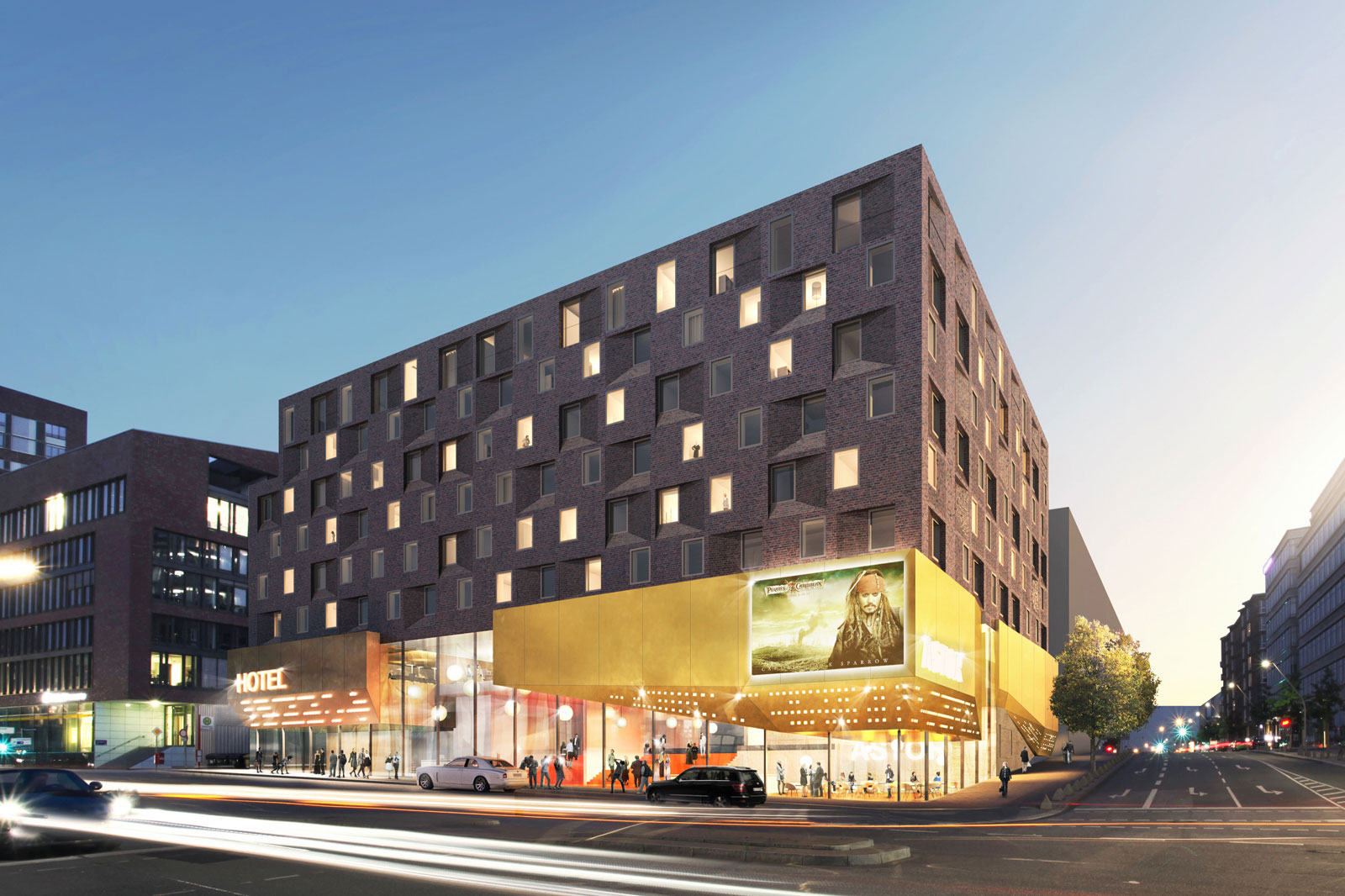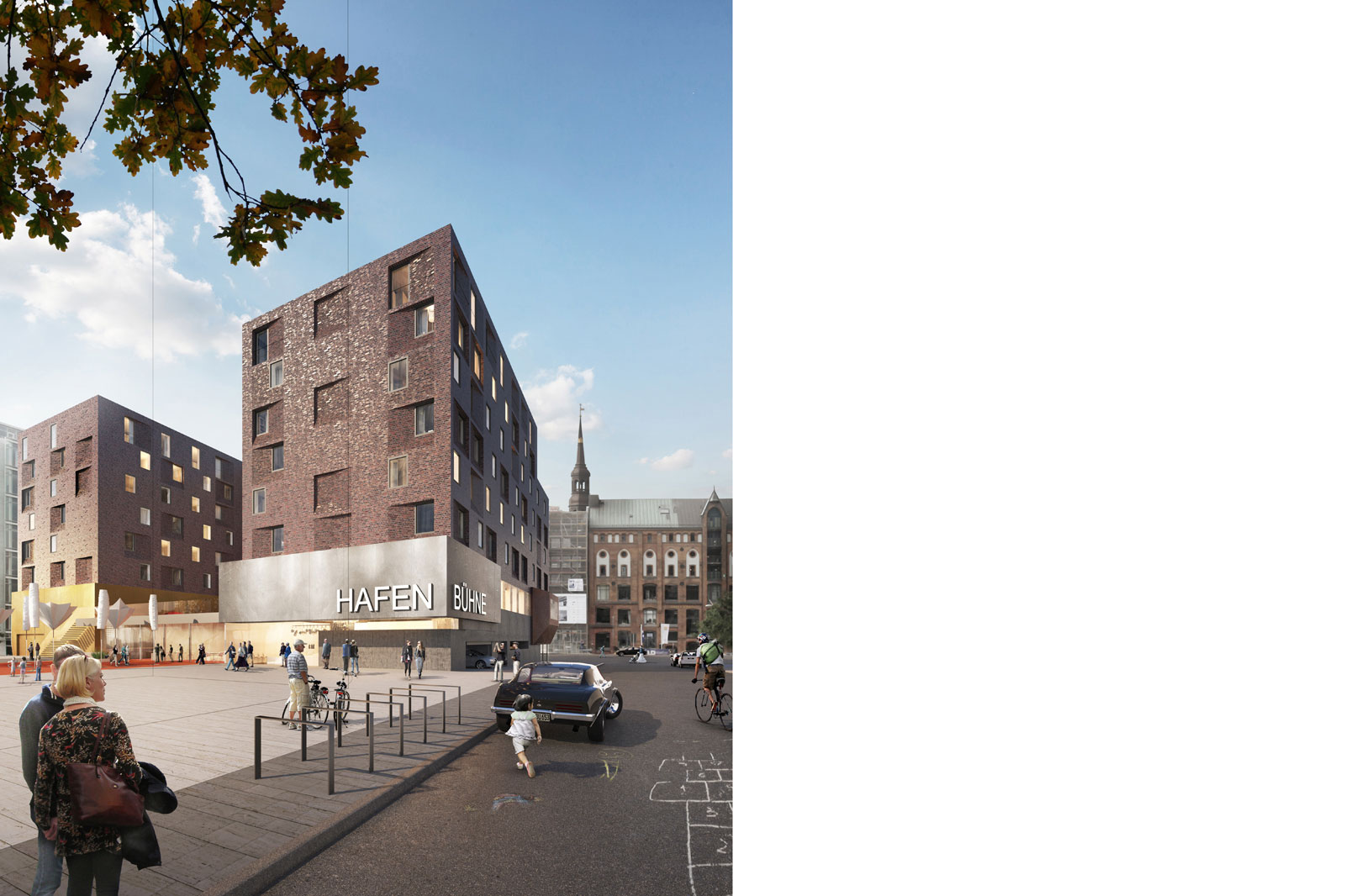 Das Gebäude besitzt in den Obergeschossen eine Fassade aus rotem Backstein. Die Fensterlaibungen werden teilweise aufgeweitet und erhalten eine plastische Gestalt. Durch diese Maßnahme bleibt das Volumen des Baukörpers in den Obergeschossen klar ablesbar, die Gestalt präsent. Zudem vermittelt die Fassade eine spielerische Großzügigkeit, ohne dabei für den Hotelbetrieb unpassende Fensterformate vorzuschlagen. Eine natürliche Fensterlüftung ist in den einzelnen Hotelzimmern möglich. Das Erdgeschoss ist mit seiner Verglasung klar der öffentlichste Teil des Gebäudes. Die eingestellten, schwebenden Kulturboxen der Kinosäle, der Lounge und der Hafenbühne sind mit ihren Metallfassaden in unterschiedlichen Farbtönen klar zu erkennen und transportieren die innere Nutzung leicht lesbar in den Straßenraum. Während die Metallkörper sich in ihrer Plastizität nach außen entwickeln und so neben der Signalwirkung auch die nötigen Vordächer erzeugen, springen die betonten Fenster in den Hotelgeschossen zurück.