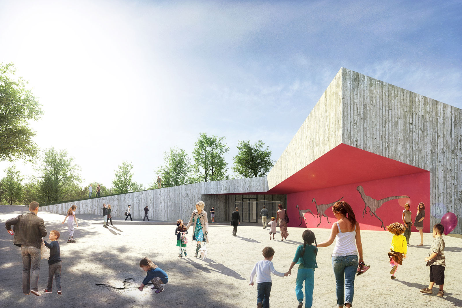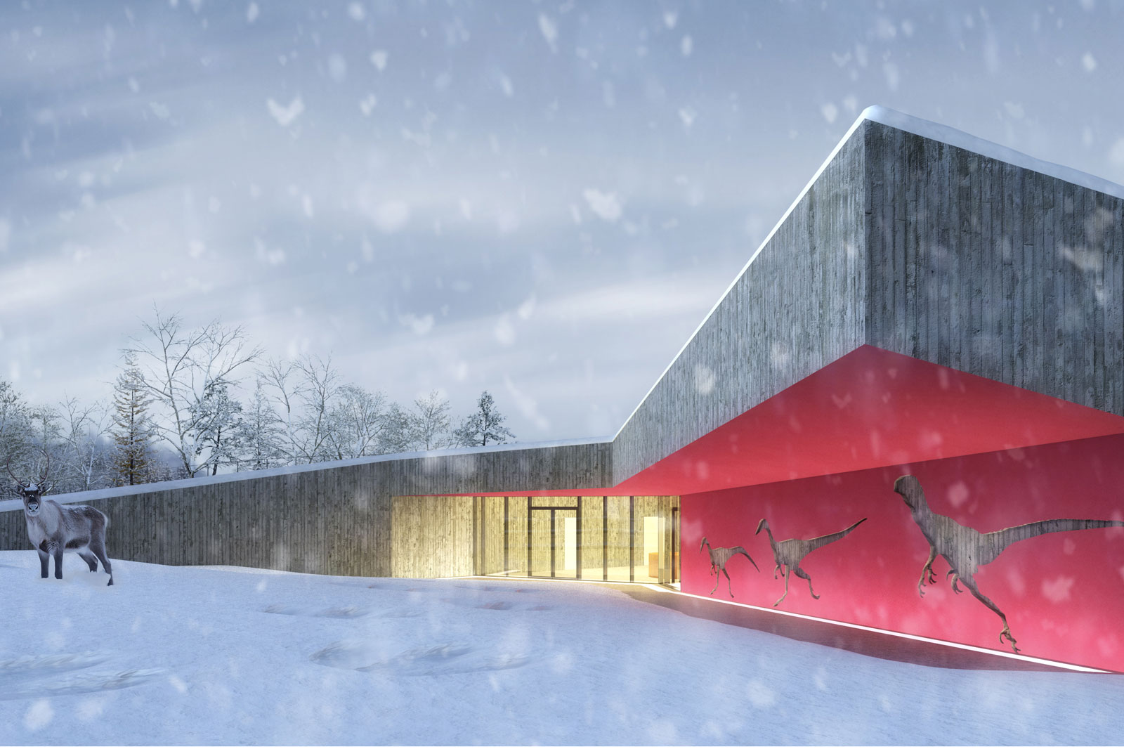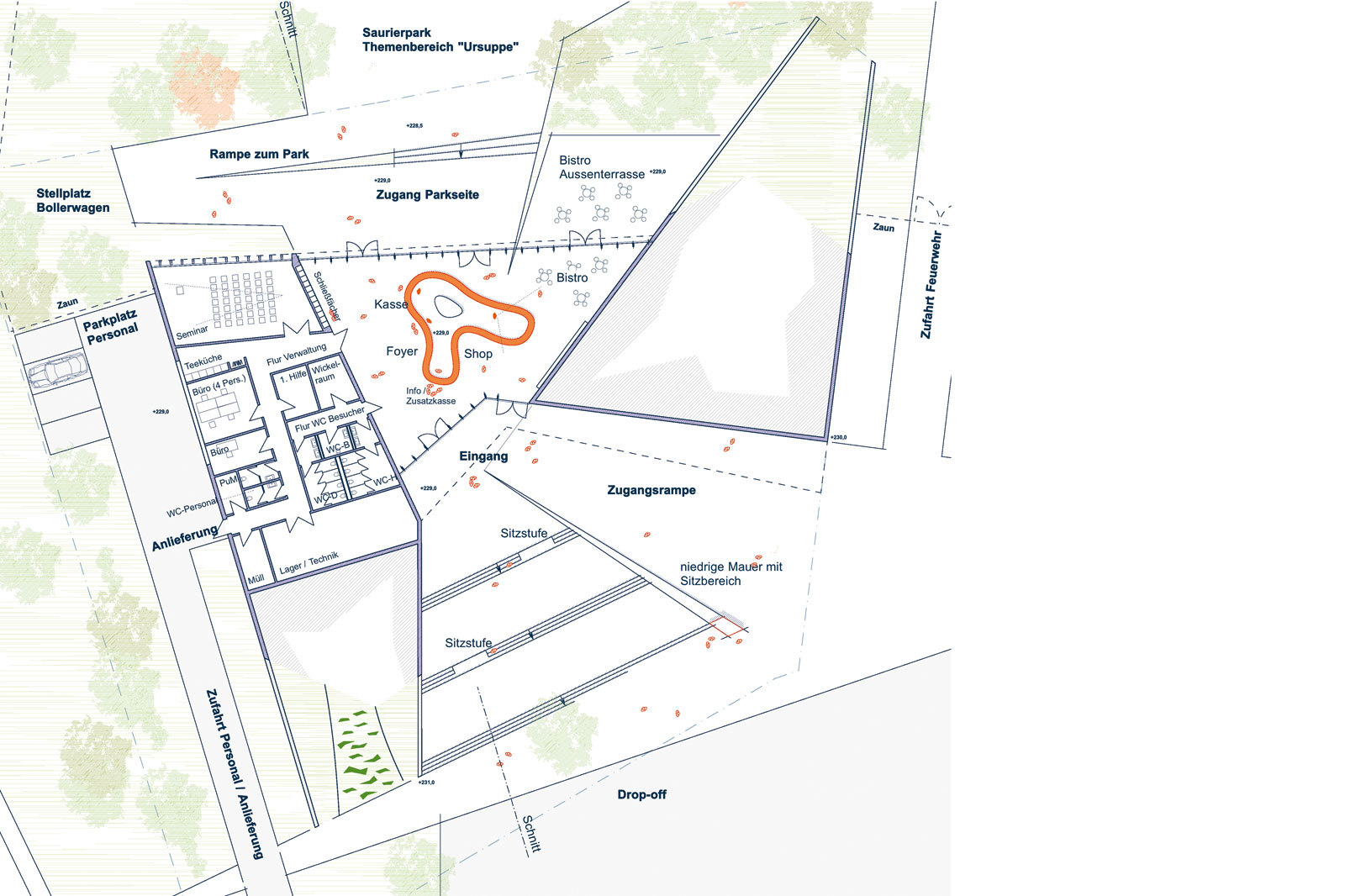 Bei der Gestaltung des neuen Zugangsgebäudes wird diese Situation genutzt. Der Besucher geht zum Waldstück hin, kann aber nur erahnen, was sich darin verbirgt. Das Eingangsgebäude tritt nicht im eigentlichen Sinne als Gebäude in Erscheinung, sondern erhält die Form von aufgeworfener Erdkruste. Tektonische Erdbewegungen haben die oberen Schichten des Erdmantels zu einem höhlenartigen Durchgang geformt, durch die das geheimnisvolle Waldstück erreichbar wird. Der Besucher erkennt die sich aus dem Boden entwickelnde Form und wird auf selbstverständliche Weise zum Durchgang in den Park geleitet. Dabei wird die vorhandene abfallende Topografie geschickt genutzt und der Effekt des Passierens eines Höhlenzugangs verstärkt. Unter der massiven Gesteinsplatte des Durchganges ist der Eingang mit den angeschlossenen Funktionen angeordnet. Der Weg führt dann auf der Nordseite des Durchganges ebenerdig weiter in den Saurierpark. Die Zuwegung veranschaulicht dadurch ganz erlebbar die Kräfte der Natur und nimmt den Besucher mit auf die Zeitreise in ein ferne Vergangenheit. Die Wegeführung ist sanft und selbstverständlich, aber auch eindrucksvoll, so dass die Anreise alsbald vergessen ist. Beim Eintreten wird die Bereitschaft geweckt, sich auf das Abenteuer Urzeit einzulassen.