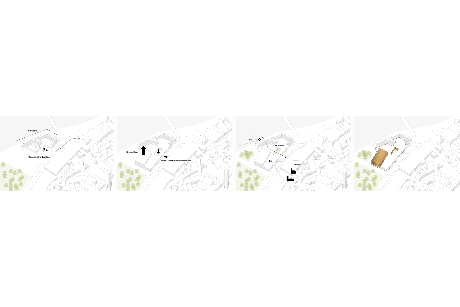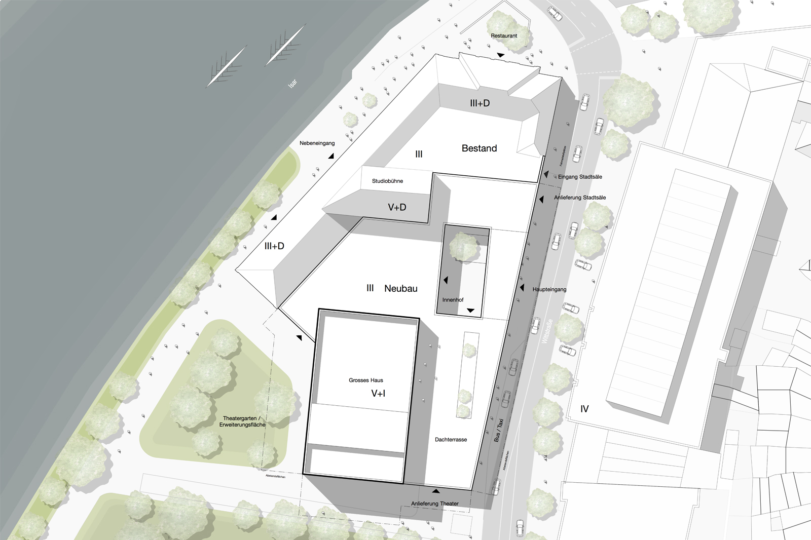 In unmittelbarer Nähe zum Ländtor, zwischen Isar und ehemaliger Stadtmauer ist der Bernlocher Komplex in seiner heutigen Form ein unfertiger Stadtbaustein. Zur Isar ist die Schauseite angeordnet, durch Wegfall der Fassung durch das Brauereigelände und der südlichen Nebengebäude, zur Altstadt hin jedoch eine reine Rückseite ohne besondere Qualitäten. An ebendieser Stelle setzt der Entwurf an. Durch die Arrondierung des Komplexes durch den Neubau wird vor den Toren der Stadt ein eigenständiger Solitär geschaffen. Die Unterschiede zwischen ehemaliger Vorder- und Rückseite werden nivelliert und ausschließlich Schauseiten geschaffen. Zugleich entsteht eine Reminiszenz an die historische Situation. Der neue Stadtbaustein wird durch einen umlaufenden Sockel und eine umlaufende Traufhöhe definiert, die sich aus dem Bestandsgebäude ableiten und das vorhandene Motiv in eine moderne, zeitlose Architektur übertragen. Über der Traufkante erheben sich zum Einen die Dächer des Bestands, als auch, weithin sichtbar, Grosses Haus und das Dach der Studiobühne. Ein neuer Innenhof gliedert das Volumen zusätzlich und schafft einen gefassten Vorbereich mit hohen Aufenthaltsqualitäten, an der ansonsten wenig einladenden Straßensituation.