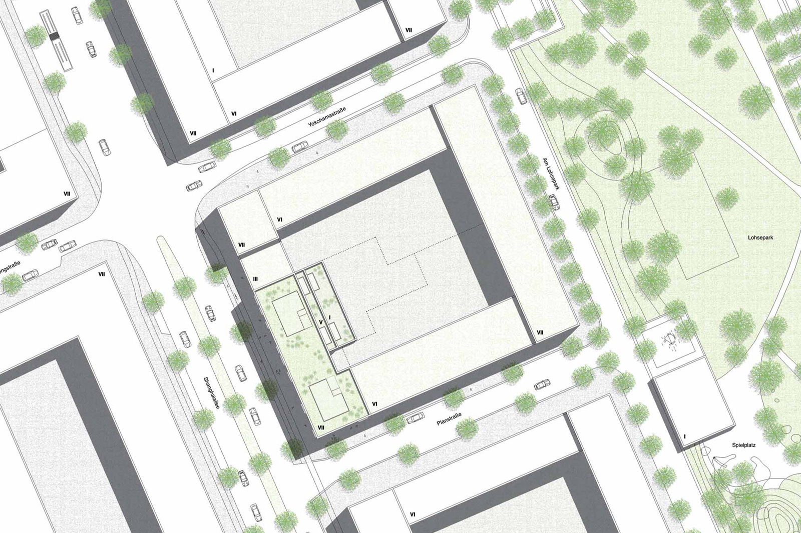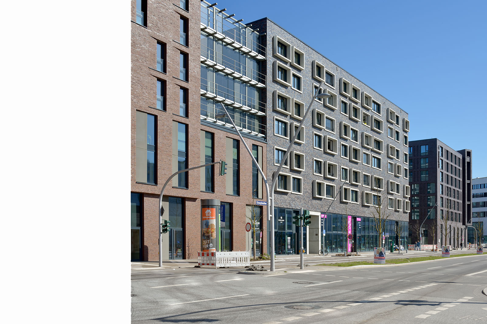 In dieser Arbeit wird ein ebenmäßig gestalteter Baublock mit einer eher geschlossenen Fassade vorgeschlagen, was in Bezug auf die Lärmsituation an der Shanghaiallee verständlich ist. Die Fenster werden ansprechend in Vierergruppen zusammengefasst. Die Fensterlaibungen sind mit unterschiedlichen Tiefen versehen, so dass die Fensteröffnungen ein Spiel zwischen Vor- und Rücksprüngen thematisieren.