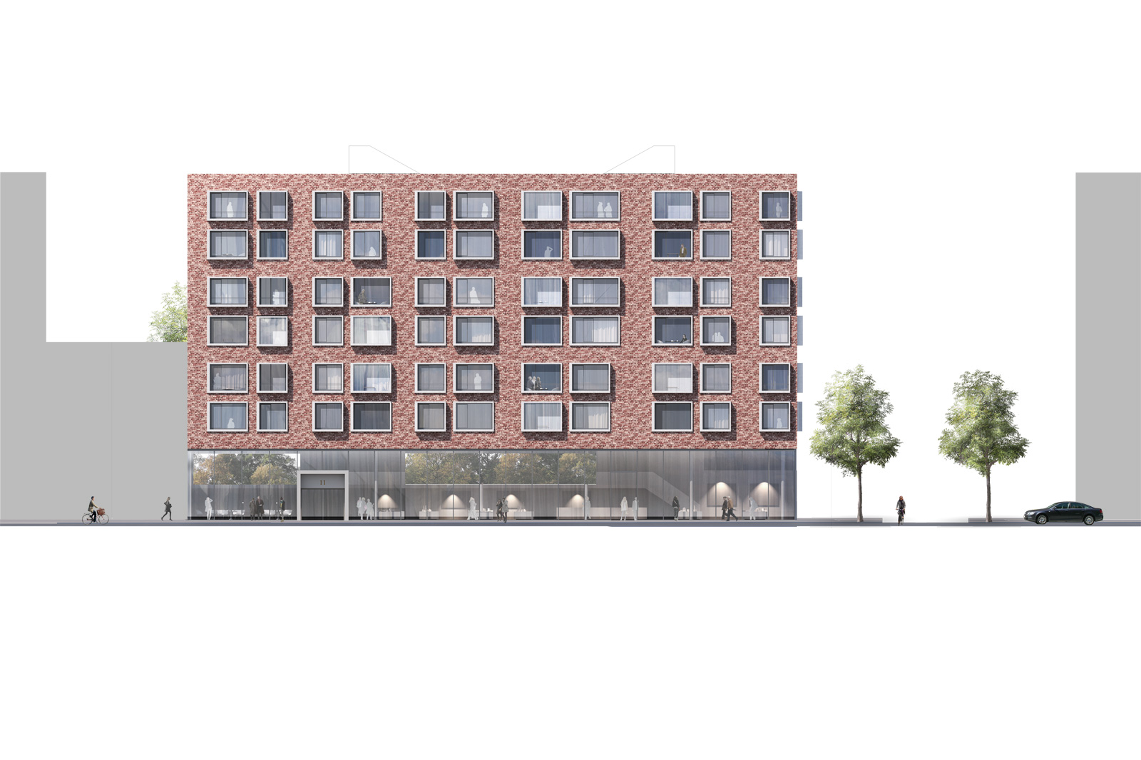 Die Sockelzone ist vollständig verglast, was dem Neubau an sich eine gelungene Leichtigkeit verleiht.