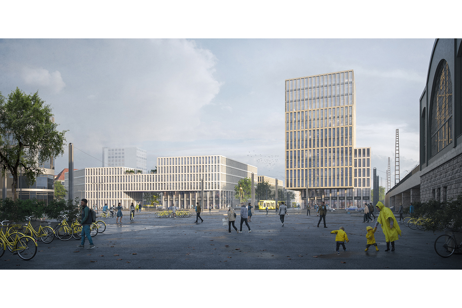 Die Arrondierung des Wiener Platzes erfolgt durch die Platzierung des 6-geschossigen Blockes entlang der St. Petersburger Straße und durch das langgestreckte Gebäude entlang der Bahngleise, das mit einem Hochpunkt abschließt.