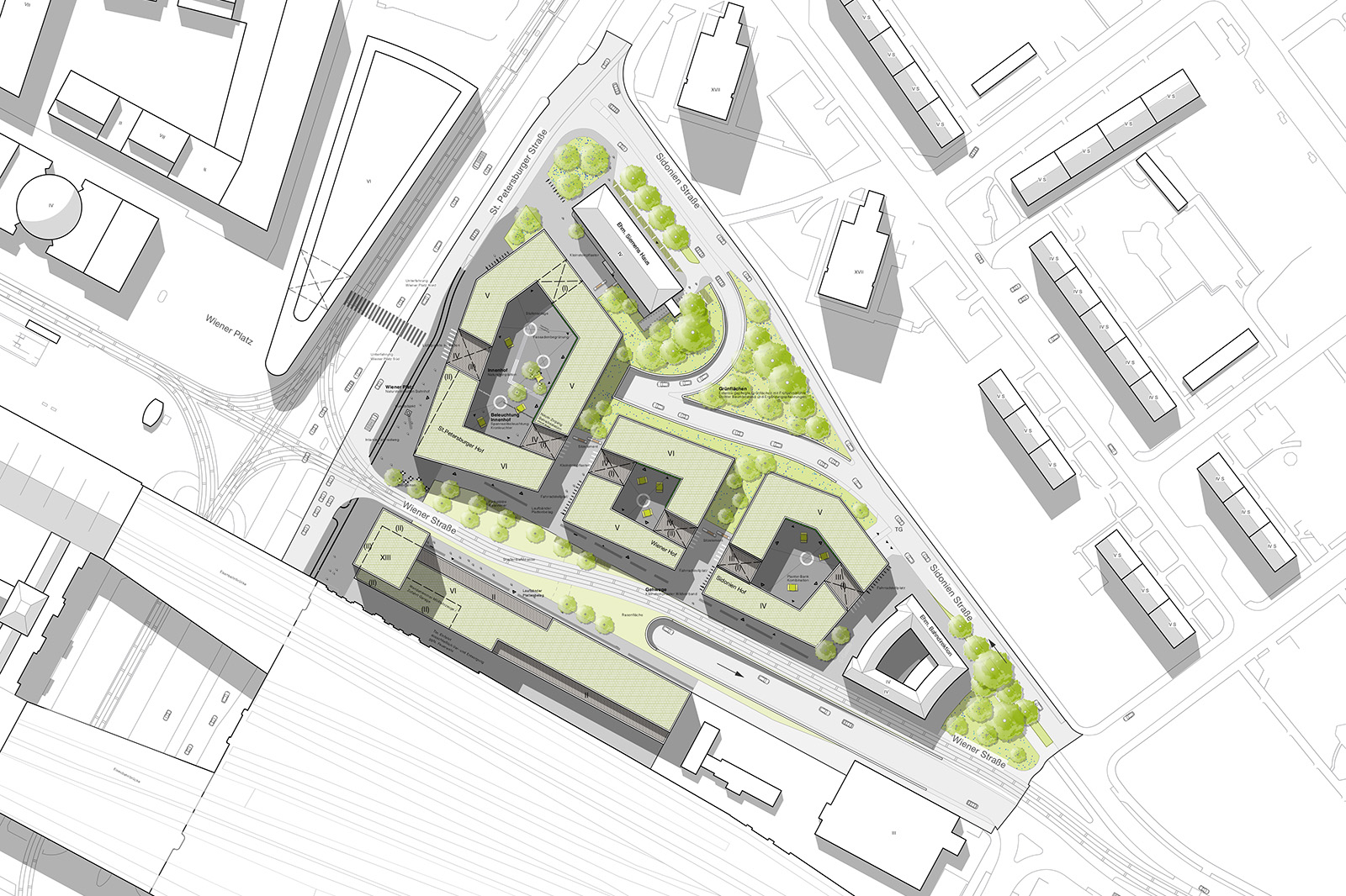 Ausgehend von der eingangs beschriebenen Ausgangssituation ist das Ziel nicht nur die städtebauliche Arrondierung des Wiener Platzes, sondern auch die Schaffung von einer baulichen Struktur, die den Lärmimmissionen und den zu integrierenden Bestandsgebäuden Rechnung trägt.