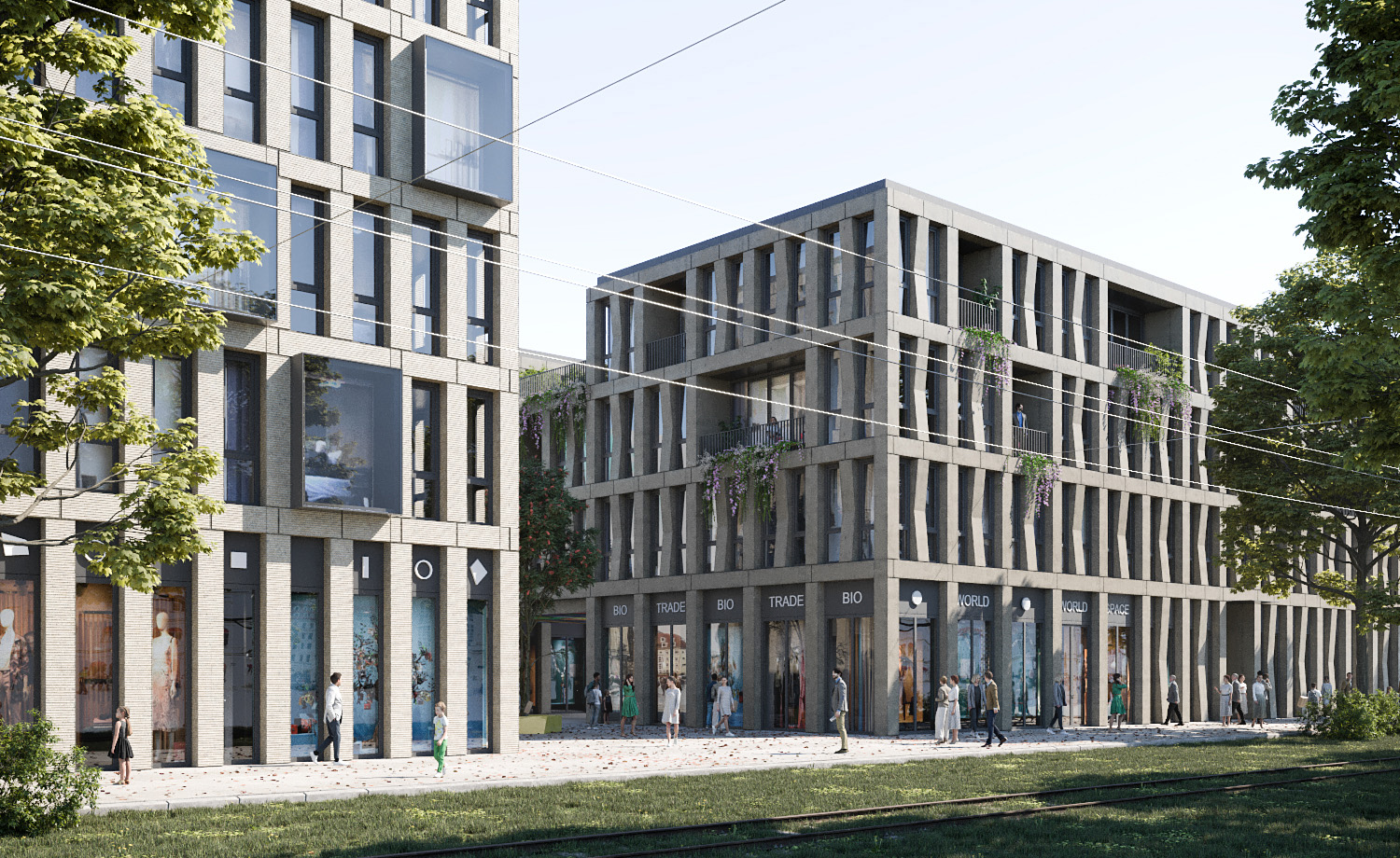 Unter diesen Umständen ist eine Struktur bestehend aus 3 Blöcken mit geschützten Innenbereichen / Höfen und einer langgestreckten Einzelbebauung entlang der Bahngleise sinnvoll. Die Blöcke wiederum bestehen aus einzelnen Segmenten mit unterschiedlicher Geschossigkeit, (Block A / St. Petersburger Hof: 6/5 Geschosse, Block B / Wiener Hof: 6/5 Geschosse, Block C / Sidonhof: 5/4 Geschosse) welche durch nochmalig abgesetzte Passstücke miteinander verbunden werden. Die Höhenstaffelung der Blöcke ist so gewählt, dass eine städtebaulich verträgliche Anbindung der Bestandsgebäude ermöglicht wird. Die Passstücke fungieren zudem als Durchgang zwischen den Blöcken und ermöglichen so eine mäandrierende, visuell sichtbare Verbindung der einzelnen Höfe.